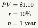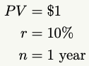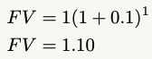Returning to the examples given in the book, let’s calculate it properly. If we’re taking $1 and compounding it by 10% over 1 year, we’ll solve for FV with the following variables: